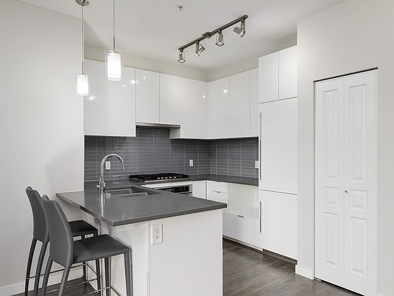 Welcome home to Alexandra Court, located in the highly sought-after Central Richmond area. This open-concept condo features high ceilings and floor-to-ceiling windows that fill the space with natural light. The gourmet kitchen features custom cabinetry with soft-close, integrated Kitchen-Aid appliances, including a gas range, and engineered stone countertops. The living area opens out onto a spacious ground-floor patio overlooking the community gardens, perfect for relaxing or extending your living space outdoors. Residents enjoy access to a 12,000 sq ft clubhouse with luxurious amenities such as a fitness centre, indoor basketball court, outdoor pool and hot tub, social lounge, and guest suite.