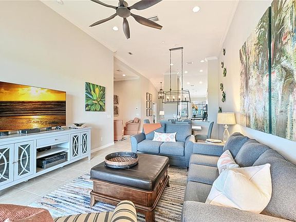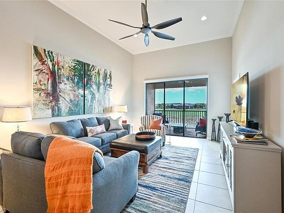 Welcome to Esplanade, one of Naples' most sought-after luxury resort-lifestyle communities. Step into this professionally decorated vacation home, where every furnishing, finish, and accessory has been thoughtfully selected to create an inviting space that seamlessly blends comfort, functionality, and style. Relax in the tiled living room with its volume ceilings or open the sliders to enjoy serene pond and golf course views from your screened balcony. The fully equipped kitchen boasts granite counters, stainless steel appliances, and a sunny breakfast area. In the primary bedroom suite, you'll find a king bed and a private bath with a step-in shower. The guest bedroom comfortably accommodates visitors with two full-size beds, and all rooms are equipped with TVs. Esplanade's sports complex is a highlight, offering amenities through the social membership, including a lushly landscaped resort pool, wellness center, Har-Tru tennis courts, and pickleball. On-site, you'll discover a restaurant, culinary center, and the Bahama Bar serving your favorite drinks and daily specials. Esplanade's perfect location is near shopping, and the pristine beaches of the Gulf are just minutes away. Naples' paradise lifestyle awaits!