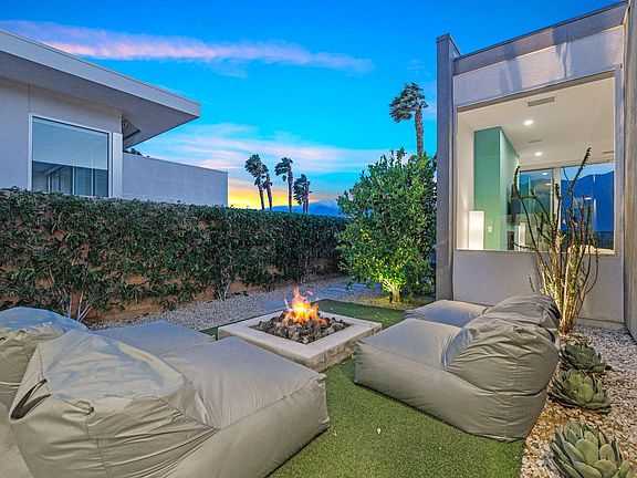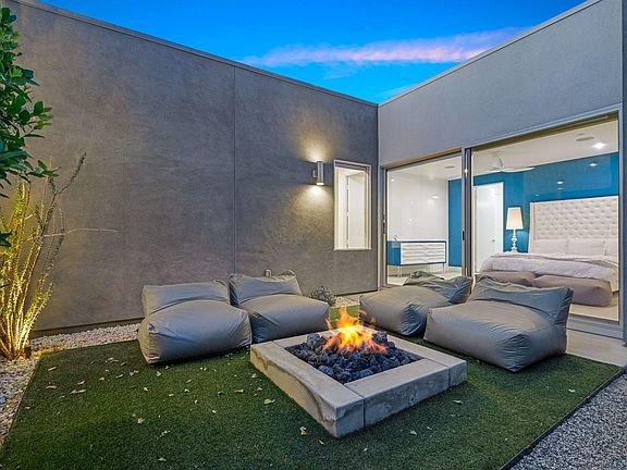 Indulge in serene evenings within the private en-suite courtyard, designed for tranquility with plush seating encircling a welcoming firepit, ideal for stargazing beneath the shimmering Palm Springs skies. Pamper yourself in the spa-like master bath, boasting dual vanities, quartz counters, a beautifully tiled walk-in shower, and two closets, offering pure indulgence at every corner.