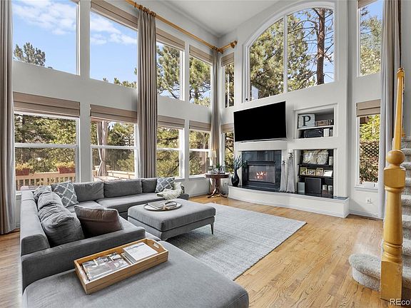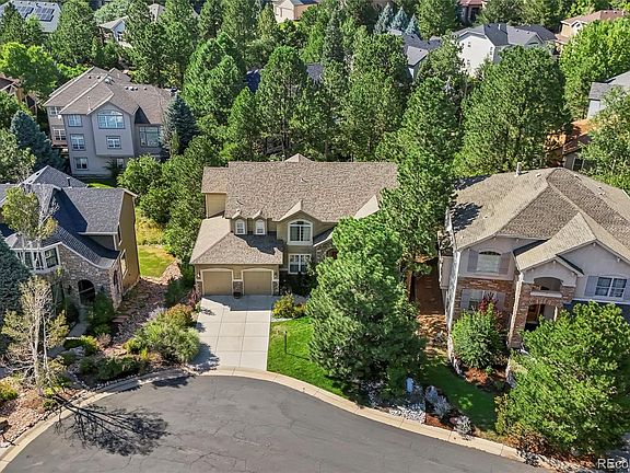 Incredible opportunity to own in beautiful Forest Park! Nested in this much sought after community, this 5 Bed, 5 Bath home is beautifully appointed, featuring soaring ceilings, open concept main floor, 3 car garage & finished walk out basement. Situated on a quiet cul-de-sac & backing to a greenbelt lined w/ mature evergreens throughout the lot & neighborhood. As you step inside, hardwood flooring flows throughout the main floor, and abundant natural light fill the rooms. The soaring 2-story family room with gas fireplace opens to the spacious kitchen featuring stainless steel appliances, gas cooktop, double ovens, walk-in pantry, convenient powder room & laundry room. This kitchen was designed for entertaining, featuring abundant cabinetry, granite countertops, kitchen dining nook & plenty of room to gather. Just outside the kitchen & family room is the private deck where you can take in Colorado’s great outdoors overlooking the serene greenbelt where deer meander often. A formal dining room & office complete the main floor. Make your way upstairs, to the vaulted primary suite; a true retreat w/ double-sided fireplace & spa-like bathroom complete with soaking tub facing the fireplace & spacious closet. Down the hall are three additional bedrooms & two full bathrooms that provide plenty of space for family & guests. The finished walkout basement is designed for entertaining, offering a large rec room, wet bar & beverage refrigerator, plus a guest bedroom w/ full bath. Outdoor living includes a main-level deck overlooking the greenbelt, a patio, & bonus exterior storage room. Additional storage in the unfinished basement, features built-in shelving & 2 newer water heaters. Residents of Forest Park enjoy a beautiful private pool & clubhouse, along with year-round events (Summer Soiree, Oktoberfest & Holiday Stroll). Surrounded by stunning evergreens, wildlife,The Ridge Golf Course, award winning schools; this community is one of Castle Pines’ most sought-after gems.