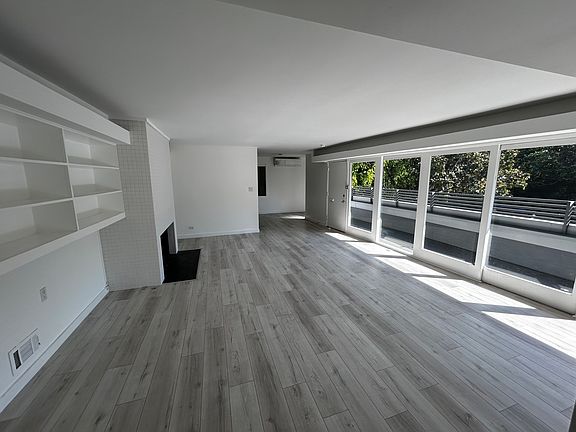 Completely remodeled modernist apartment, steps from UCLA and across from the W Hotel. Very bright, secure front unit. Large sliders across the entire front of the unit open onto a private gated patio, and allow for perfect indoor-outdoor living. Ample kitchen with all new surfaces and stainless-steel appliances, dining area, large living room with working fireplace, large bedroom and bathroom, great closets, full size washer/dryer, and A/C. Two tandem garage/driveway parking spaces. Pets allowed with additional deposit.