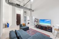 Modern industrial interiorsHigh ceilingsRooftop retreatStainless steel appliancesIn-unit stacked laundry