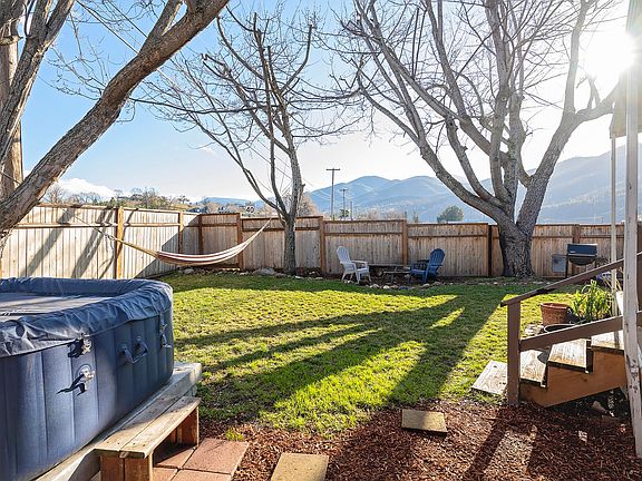 This home has stunning views of Grizzly Peak and the Ashland Watershed. Enjoy the beautiful views and occasional wildlife from the fully fenced private yard while relaxing in the hottub or sitting under the covered porch. Additional privacy comes from being on a corner lot. There are two covered parking spaces and a detached shed with power. The home has a lovely kitchen with a gas stove and tile counters. The primary bathroom has been updated with new paint, shower surround and tub. There is newer paint throughout this adorable home as well as new flooring. It also has gas heat. Motivated seller!