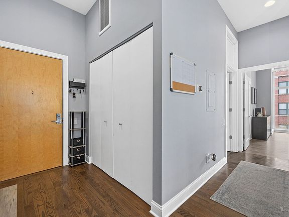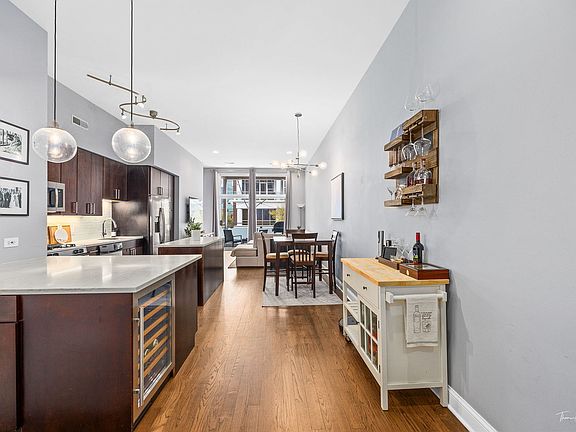 This stunning 2-bed, 2-bath condo in a boutique West Loop building offers a perfect blend of style and convenience. Situated on the northeast corner, the home features an open floor plan, dramatic high ceilings, and breathtaking views. Dark espresso hardwood floors flow throughout, including the bedrooms, complementing the 2015 updates to the kitchen and bathrooms. The modern kitchen is equipped with espresso cabinets, white quartz countertops, a glass tile backsplash, stainless steel appliances, a wine fridge, and a spacious island perfect for entertaining. The primary suite includes a sunlit sitting area, his-and-hers walk-in closets, and an en-suite bath with a double vanity, quartz counters, heated floors, and a Euro-style walk-in shower. Both bedrooms are fully enclosed with large windows, and every window is fitted with motorized blinds. The unit features a private balcony, and in-unit laundry. Located steps from top restaurants, Whole Foods, Mariano's, Starbucks, and easy access to the Green/Pink lines and major bus routes. Heated garage parking (space #29) with a full-height storage cage is included in the price. This is West Loop living at its finest!