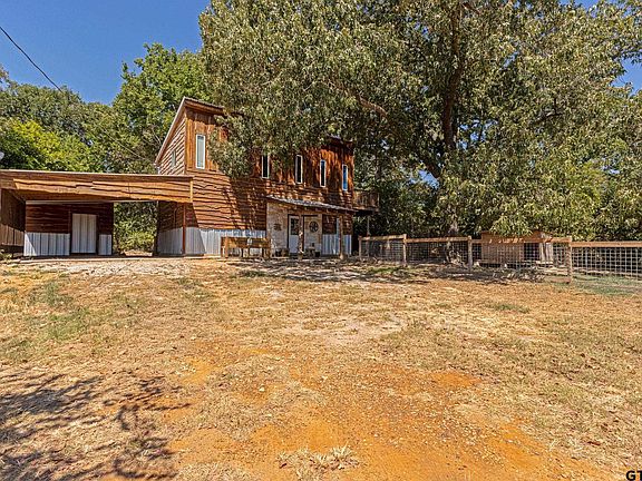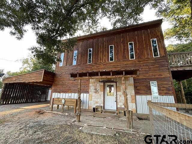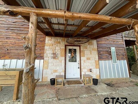 Nestled in Lollipop Landing, a serene lake subdivision, your dream home awaits. Built in 2019, this stone, cedar, and corrugated tin residence is brimming with custom features and offers private dock access for your boating and leisure enjoyment. Beyond the stunning live cedar edge board and flagstone exterior, discover a welcoming living room and open-concept kitchen, complete with granite countertops, cedar cabinets, and sleek subway tile backsplash. The main floor offers a cozy bedroom, convenient laundry in the bath, and stunning stained concrete floors. Ascend the antique stair railing to a huge upper-level room, boasting a deck and a spacious en-suite bath with a double vanity. Additional amenities include a 20' x 24' carport, 16' x 20' storage building, charming tin ceiling, wood accents, elegant hardware/fixtures, and outdoor spaces galore: an open deck, covered flagstone patio, and fenced dog run complete with a dog house. Ideal as a weekend retreat, starter home, or vacation haven. Truly, a unique gem!