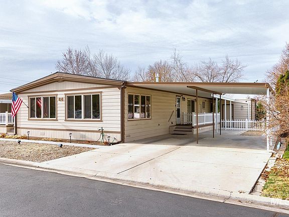 Beautifully updated home in desirable 55+ Aspen Creek community, offering modern upgrades, energy efficiency, and exceptional comfort. Regularly scheduled community social events. Move-in ready property features a new reverse osmosis system, kitchen with stainless-steel appliances, extended counters, added cabinetry, backsplash, and a new faucet. Dual-pane windows and sliding doors—many tinted—are paired with updated blinds. Luxury vinyl flooring, crown molding, textured walls, and replaced interior doors enhance the home’s clean, contemporary feel. A master electrician inspected all outlets, and the ADT security system provides added peace of mind. Laundry room includes a sink, cabinets, closets, new waterproof flooring. Bathrooms feature ADA toilets, and the hall bath includes a remodeled walk-in shower. Additional updates include a remote-controlled gas stove, new ceiling finishes, new thermostat, and newer water heater and softener. Exterior upgrades include extra insulation, new gutters, three new sidewalks, and three Fiberon decks—two covered—plus a new roof and a snow-melt system on the back deck. The private backyard offers sprinklers, fresh landscaping, and white vinyl fencing. A covered two-car carport and insulated storage shed/shop with power provide excellent convenience. Lot rent, water, sewer, and trash $716/mo. RV parking available for a minimal fee through park.