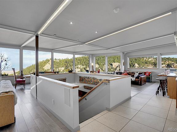 SPECTACULAR - Located 15 minutes from Boulder and Golden and just 25 minutes to Denver, CLOUD NINE is a mid-century modern inspired architectural marvel. Set into a mountainside, a commanding pedestal supports a cantilevered upper level that rises above the surrounding forest. Wall to wall and floor to ceiling windows provide panoramic views extending from the monumental Fountain and Lyons rock formations out to the eastern plains.