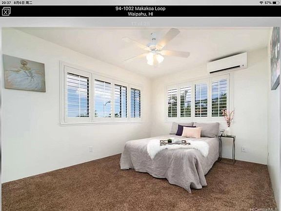 Royal Kunia, a well-maintained 3-bedroom, 3-full-bathroom house with a large yard on a corner lot. Large grass area in front of the house. Mango and pomelo trees. Partially furnished with a 75-inch Sony TV with a TV stand, a sound bar, a sectional sofa, one queen-size bed, a wine cabinet, a study desk, an office chair, and an outdoor sofa. 6 split AC units, plantation-style shutters. Rent includes monthly yard service. Pets are negotiable upon interview.