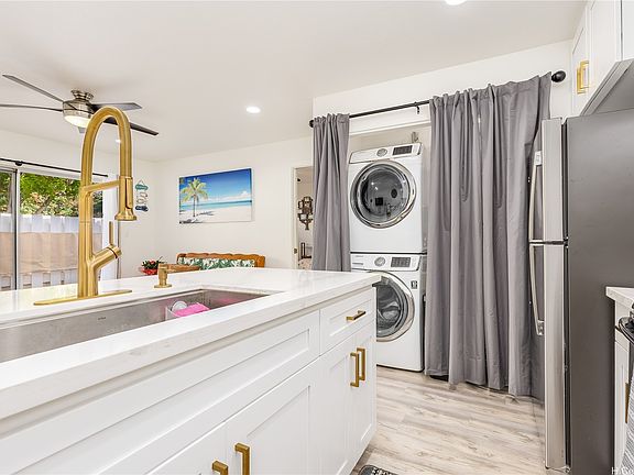 Ground floor 1-bedroom unit in Waipio Gentry featuring two assigned parking stalls plus plenty of nearby street parking. This fully renovated townhome offers an updated kitchen, luxury vinyl plank flooring, a full-size washer and dryer, a spacious walk-in closet, and a beautifully updated bathroom. Step outside to your own private fenced outdoor space perfect for your potted plants or for entertaining! Directly across the street, enjoy Waipio Neighborhood Park and walking paths throughout the community. You'll enjoy the convenience of being located just minutes from shopping, restaurants, banks and freeway on/off ramps.