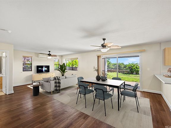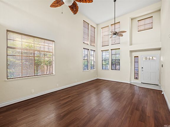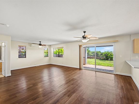 2.25% VA Assumable ($665,000) Seller to retain VA Benefits. Situated on a quiet cul-de-sac overlooking the 14th green of Royal Kunia Golf Course, this 3-bed, 3-bath home offers spectacular, panoramic views from Diamond Head to Pearl Harbor. Enjoy the scenery from both upper and lower lanais. Inside, find comfort and efficiency with split AC's and a money-saving Solar Electric system. The property includes a 2-vehicle garage and a lush, edible garden featuring mature mango, avocado, tangerine, chico, and lemon trees. Excellent outdoor living space with both upper and lower lanais, you have the perfect vantage point for savoring your morning coffee or entertaining guests against a stunning backdrop. Gaze out at the incredible, sweeping views of the Honolulu skyline, from the iconic silhouette of Diamond Head to the historic waters of Pearl Harbor.