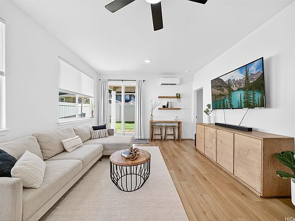 Discover the perfect blend of comfort and convenience in this charming Waioha single-level 3-bedroom, 2-bath home nestled in the beautiful and growing community of Koa Ridge. Designed with families in mind, this home offers an open floor plan with 9-foot ceilings, split A/C in every room, and stylish finishes throughout. You’ll love cooking and gathering in the modern kitchen featuring stainless steel appliances, a Kohler double sink, solid-surface countertops, and white soft-closing cabinets. Thoughtful details like USB outlets in the kitchen and primary bedroom add everyday convenience, while luxury vinyl plank flooring and wall-to-wall carpet bring warmth and durability for busy family living. Step outside to your fully fenced yard with a covered lanai—perfect for outdoor meals, weekend BBQs, or letting the keiki and pets play freely. Energy-efficient upgrades include a solar hot-water system, EV-ready garage outlet, PV-ready setup, LED lighting, and an ENERGY STAR® dishwasher to help keep your home running efficiently. Conveniently located near Waipio Costco, shopping centers, parks, schools, and with easy freeway access—everything your family needs is just minutes away.
