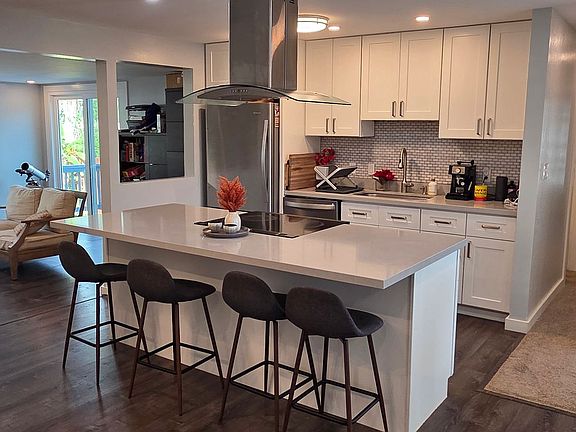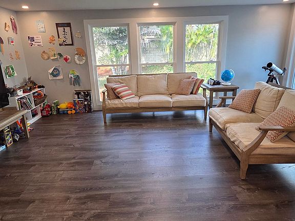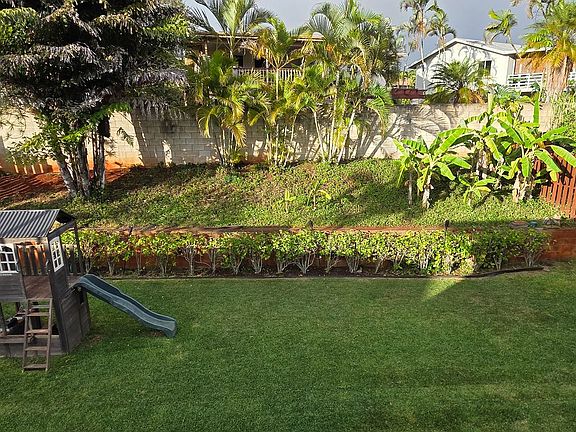 Available December 10, 2025 - Large partly furnished (furniture shown in pictures is not included) two story home in Mililani Town offers contemporary renovations with tasteful cabinets, countertops and plank vinyl flooring. Stainless steel kitchen appliances include glass top range/oven with ceiling mount range hood, refrigerator and dishwasher. Open floor plan from dining area to entertainment room and second floor deck flows perfectly for entertaining. Split AC cools the upper and lower main living areas. Three bedrooms and one bathroom on upper level. Primary bedroom has external access to the open upper deck. Lower level off of garage entry includes guest bedroom, full bath with step in shower, large study and additional entertainment area with access to the covered lanai and spacious fenced back yard. Large two car garage (560 sq/ft) includes laundry area, sink and access to covered lanai and a spacious landscaped/fenced back yard. The driveway accommodates two additional parking stalls. Puanane Loop is near Mililani High School and the Mililani Town Center. Partly Furnished includes all major appliances and is MOVE-IN-READY.