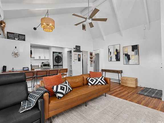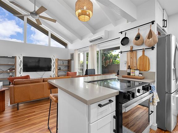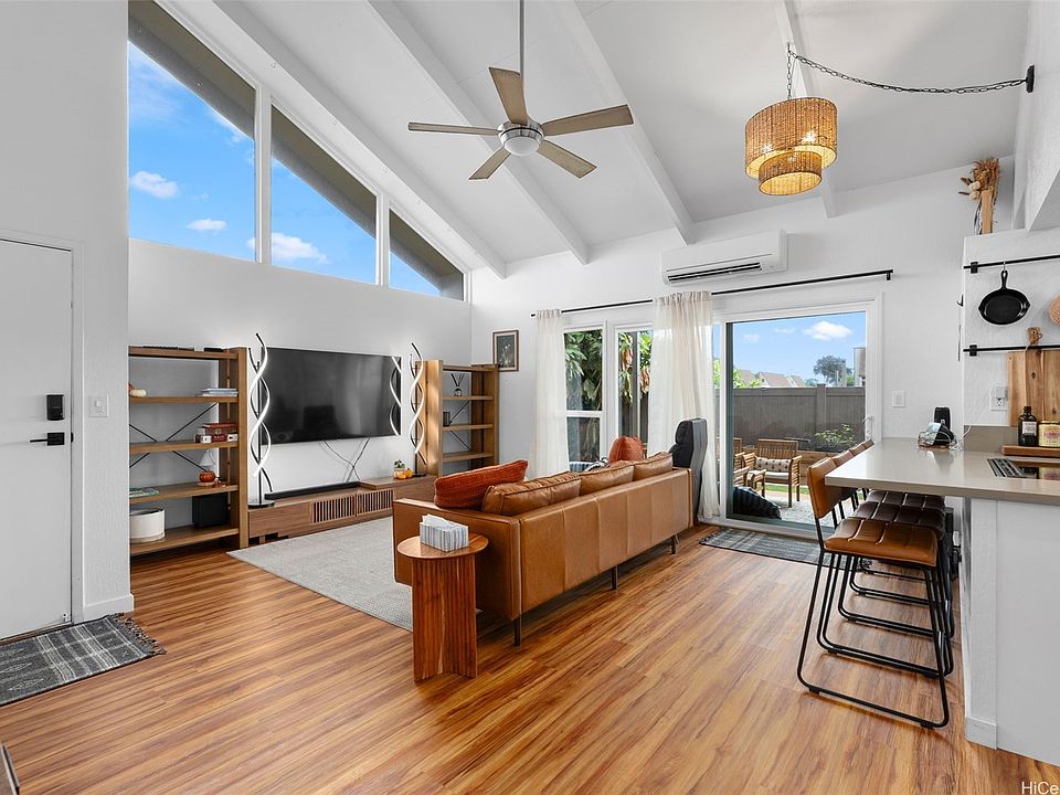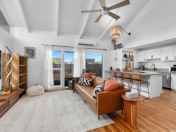 Renovated 2-bedroom, 1-bath patio home in Mililani Town with 2 convenient parking stalls located near the front entry. This move-in ready home offers beautiful vaulted ceilings with high windows that bring in natural light, new recessed lighting, split AC, and durable vinyl plank flooring throughout. The open-concept kitchen and living area features neutral quartz countertops, white cabinetry, and brand-new stainless steel appliances including a dishwasher. Enjoy new windows and sliding doors, two private landscaped yard spaces with a cacao tree, plus a covered lanai—perfect for island-style outdoor dining. A wonderful opportunity in a desirable community.