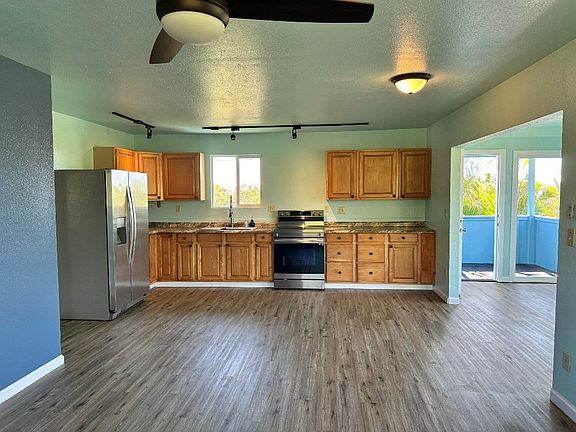 Newly renovated and Move-In Ready Home in Green Sands Subdivision!!<br>This CHARMING home on a LUSH corner lot could become YOUR own Private Retreat!!<br><br>It has MANY Brand New upgrades that make this a MUST SEE:<br><br>*Freshly painted Exterior<br>*Freshly painted Interior<br>*Newly redone cabinetry in the Kitchen<br>*Brand New Waterproof vinyl flooring throughout the whole house<br>*Brand New oversized vanity and mirror in the Bathroom<br>*New High-End remote controlled ceiling fans in Bedroom and Living Space<br>*Brand New Electric Range<br>*Brand New Farmhouse Stainless Steel sink and Water Faucet <br>*Newly installed Counter Tops <br>*New Wooden Privacy Fencing<br><br>There is a fully fenced yard for added privacy and various shrubs, greenery, and fruit producing plants throughout..including:<br>a beautiful monkey pod tree that shades a large portion of the yard, bananas, soursop, kukui nut, a milo tree, two dwarf mango trees, coconut trees, and a variety of palms. <br>The open floor plan layout maximizes the living space and the MANY windows make it feel light, bright and airy! <br>With one lanai off the front (78 sq ft) and another off the Bedroom (96 sq ft), you have a few places to enjoy your morning coffee and the cool Hawaiian breezes! The original lanai was also fully enclosed with permits to expand the living area (192 sq ft). TOTAL square footage = 942 sq ft.<br>There is overhead electricity and already installed fiberoptic HIGH SPEED internet capability. <br>The home is on catchment with a 2500 gallon water tank and Brand New gutters just recently installed. With TWO separate 100 amp electrical panels, one for upstairs and one for downstairs, the possibilities are endless for all the EXTRA BONUS space underneath the home. This area could be completed in the future to add much additional living space and square footage! <br><br>Come and See