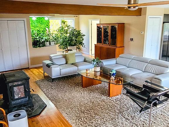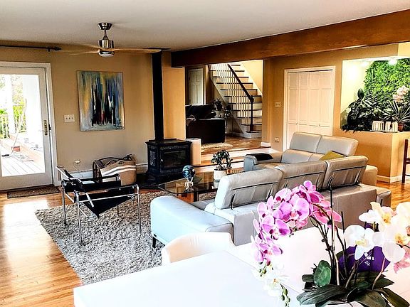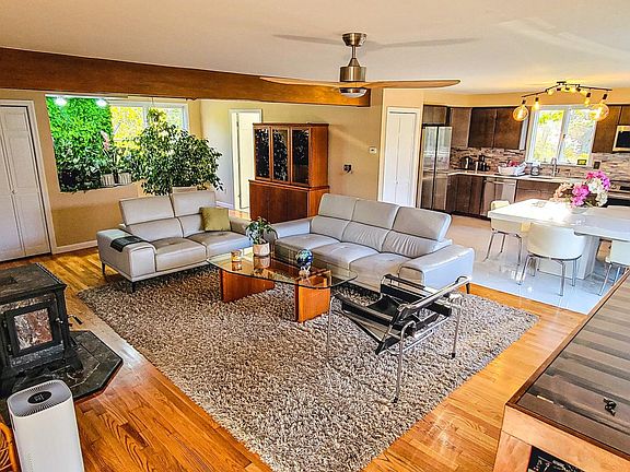 The remodeled open-concept home features a massive ground-level living room area bathed in sunlight and natural materials, with a Euro modern eat-in kitchen featuring new stainless appliances, induction cooktop, and white quartz countertops. The recently repainted living space with refinished hardwood floors is centered around an attractive working soapstone wood stove, with a mini split/heat pump. Adjacent to the living room is an updated tiled bathroom with new washer/dryer and a large, comfortable TV room/den. Upstairs you will find an enormous sunny study/library area with vaulted ceilings perfect for working from home, looking out over the park-like grounds and classic New England beautiful barn. There are 2 huge bedrooms and a Jack-and-Jill renovated bath with tiled glass shower enclosure. The house has ample closet space and a full unfinished basement with basic work-out equipment. NO PETS. Fast internet! Perfect for remote or hybrid work.