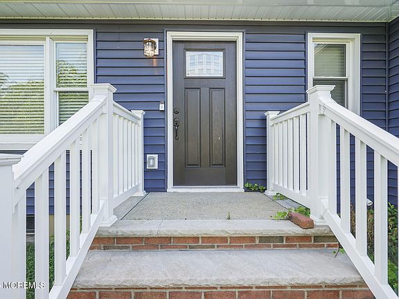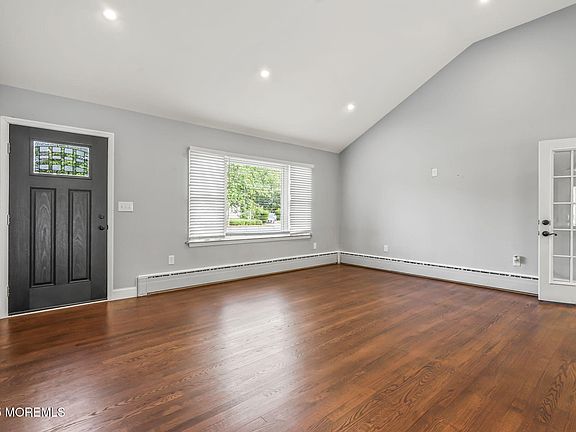 As you enter, the home opens to a spacious living room featuring hardwood floors, recessed lighting, and high ceilings. The living room flows seamlessly into the updated kitchen, which boasts a large center island with breakfast bar seating, a farmhouse sink, stainless steel appliances, recessed lighting, and ceramic tile flooring. Sliding glass doors lead to a spacious Trex deck. Convenient access to the basement is also located just off the kitchen. Down the hall, the primary bedroom features hardwood floors and direct access to the full bathroom with a shower stall. Two additional bedrooms, both featuring hardwood floors and recessed lighting, along with a full bathroom, complete this side of the home.