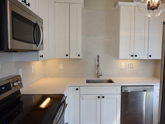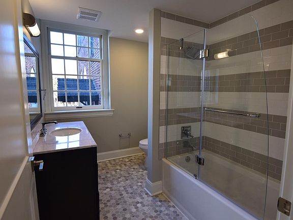 Large one bedroom flat with modern amenities in historic building, beautiful high end finishes, modern conveniences, off street parking, laundry in unit, quartz counter tops and hardwood floors. 12 month lease, includes off street parking. Resident pays utilities.