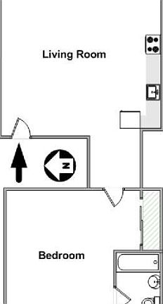 Adjacent to the living room but separated by a wall is the kitchen alcove area equipped with modern cabinetry, stainless steel appliances and a backsplash reminiscent of NYC's famous subway tiles.