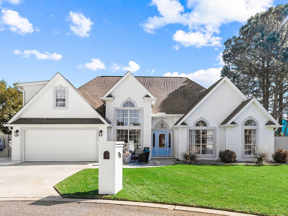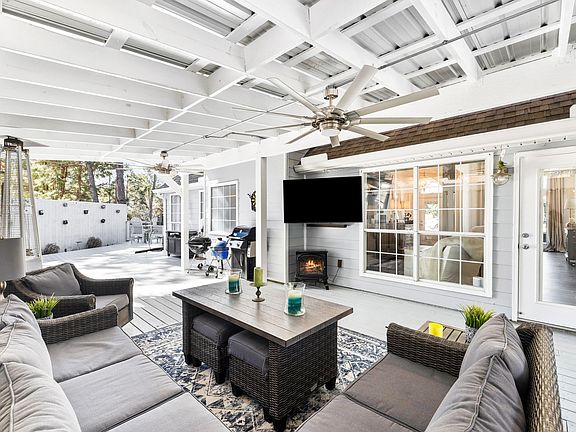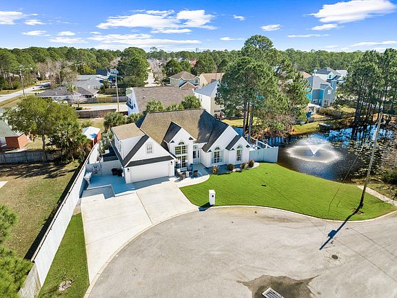 Enjoying an enviable cul-de-sac location and overlooking a neighborhood pond and fountain, this upgraded home sits on an extra-large lot. Everything has been tastefully updated, from lighting and paint to the new LVP flooring. The result is an absolutely stunning home that's a showpiece. Vaulted ceilings create a bright and inviting ambiance in the spacious living room which seamlessly segues into the dining area with a floor-to-ceiling feature window. The corner gas fireplace is nestled beneath a floating cypress mantle in a beautiful shell wall. New shiplap leads the way into the chef's kitchen which is superbly equipped with stainless steel appliances and granite countertops. An attractive barn door cleverly disguises the laundry. Doors open onto a huge covered deck that provides a beautiful outdoor area for lounging, entertaining and watching TV. The warm glow from the fireplace makes this a year-round retreat complete with a bubbling hot tub. The newly landscaped yard has a peaceful decked sitting area overlooking the tranquil lake and fountain. With three bedrooms located on the first floor, this home is ideal for those heading for retirement and taking life easy. Recent remodeling includes a new water heater, HVAC and all new appliances. Bathrooms were finished with eye-catching wall tile. The master suite includes a large walk-in closet and a beautiful wet-room-style bathroom with Spanish tile, an open shower and a separate soaking tub. A beautiful hardwood stairway leads to the second floor where you will find the private fourth bedroom with full bathroom that provides bay views. In addition, two spacious attic closets, currently used as a home office and sitting room, provide additional floored storage. This fabulous home in Olde Florida Lakes is a short golf cart ride to the Emerald Coast beaches and within easy reach of popular restaurants and shops. Close to Legion Park boat launch, it's ideal for boat lovers and fishing enthusiasts to indulge their passion. The remodeled yard includes lush landscaping and three storage units for housing garden furniture and beach equipment. It even has a newly added fish-cleaning station. There's loads of parking for extra vehicles, an RV and boats and best of all, this stunning home has no HOA.