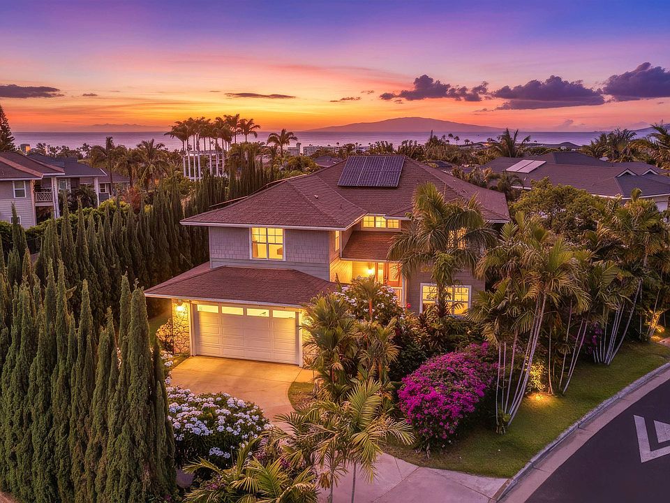 Nestled in the desirable Moana Estates w/ an Oceanview! Just a short drive from Wailea, Kihei, and South Maui’s pristine beaches, 94 Laukahi is a breathtaking 4-bedroom, 3-bathroom residence with a versatile bonus room. Positioned on a tranquil corner lot with only two neighboring properties, this home offers unparalleled privacy and mesmerizing views of Haleakala Mountain and vibrant ocean sunsets from both the lanai and living areas. The gentle trade winds enhance the seamless indoor-outdoor Maui lifestyle, creating a refreshing and peaceful atmosphere perfect for those craving a calm island escape. Enter through the impressive front entrance to discover elegant tigerwood flooring that flows upstairs into the spacious main living space. The modernized kitchen, ideal for both everyday dining and hosting, features sleek granite countertops and stainless steel appliances. A convenient laundry room is equipped with a stylish black steel front-loading washer and dryer. Built with sustainability in mind, the home boasts 27 owned solar panels for low electricity costs and a garage with two EV charging stations. The private, fully irrigated yard is a tropical haven, adorned with Italian cypress, fruit-bearing avocado, tangerine, and orange trees, alongside aloe vera, ginger, and fresh herbs. Vibrant lipstick palms and plumeria trees complement the lush setting, while a volcanic rock wall ensures seclusion and a deep connection to nature. The expansive bedrooms prioritize comfort with plush carpeting and generous closet space, and each ground-floor bedroom opens directly to the backyard lanai, blending indoor and outdoor living effortlessly. This home is well built and low maintenance materials such as cement board siding. From the lanai, savor stunning Pacific sunsets that paint the sky nightly, offering a serene and convenient retreat that perfectly balances relaxation and accessibility in an extraordinary island home.