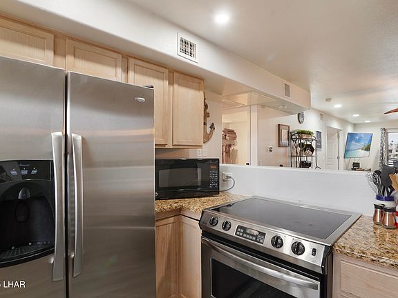 Waterfront living at Kings View Condos—right on the iconic Bridgewater Channel! This beautifully updated 2-bed, 2-bath condo puts you in the heart of Lake Havasu's best boating, dining, shopping, and year-round events. Inside, enjoy stylish tile flooring throughout and remodeled bathrooms that give the space a fresh, modern feel. Take your gatherings outdoors on the oversized covered patio—perfect for relaxing, entertaining, or soaking in the vibrant channel views and activity. The gated Kings View community offers incredible amenities, including a sandy beach for playing or parking your boat, a sparkling community pool, covered parking, and additional boat parking. Whether you're looking for a vacation retreat, full-time residence, or high-demand rental opportunity, this waterfront gem delivers the ultimate Havasu lifestyle.