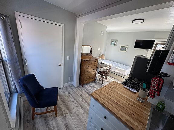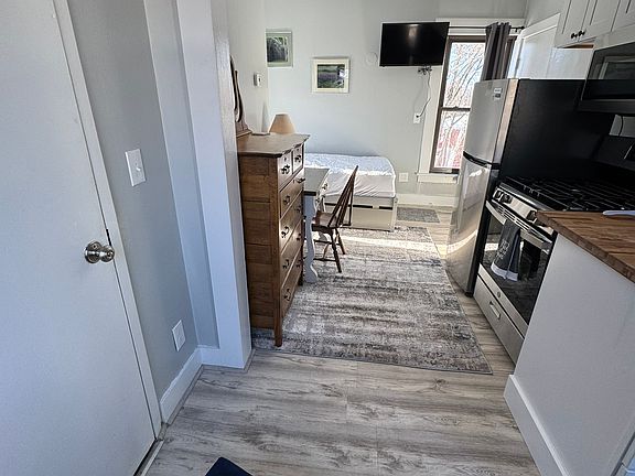 All private 2nd floor studio unit with full kitchen. Smart TV, desk, upholstered chair, bureau and closet. Full size stove and refrigerator, coin-operated laundry room just below this unit. No smoking building. Minimum 90 day stay. Large off-street parking lot. Near bus stop and local walking/biking trail.