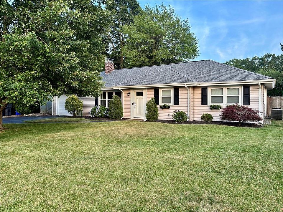 Welcome to single-level living at its finest in the highly sought-after Governor Francis Farms neighborhood! This charming home features a newly sealed front driveway and beautifully maintained mature landscaping, all wrapped in low-maintenance vinyl siding. Step inside through the new mudroom and into a spacious open-concept living area that seamlessly connects the living room, kitchen, and dining space- perfect for modern living and entertaining. On one side of the home, you'll find three bedrooms and a full bathroom with a tub. Off the dining area, a dedicated laundry room offers convenience with a folding table, bonus storage closet, and attic access for additional storage. The attached garage has been transformed into a fully equipped home gym but can easily be converted back for vehicle use. At the rear of the home, enjoy a sun-drenched den or office with vaulted ceilings and a sliding door that opens to a fully fenced backyard. The new patio is ideal for outdoor gatherings and family fun. Additional features include; new roof (Nov. 2020), central air & high-efficiency baseboard heating. Don't miss this move-in-ready gem in one of Warwick's most desirable neighborhoods!