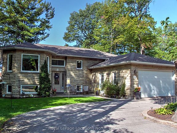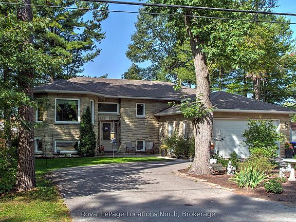 Location, Location, Location! Welcome to this lovely home just steps from the tranquil Nottawasaga River. This beautifully maintained 4 bedroom, 3 bathroom sits on a generous , tree lined lot. Located across from protected Ministry Forest, this property offers privacy and located across the street from scenic walking trails. Inside you'll find a spacious layout perfect for families. The main level features a custom maple kitchen with hardwood floors throughout, leading into the spacious living room. Doors from the dining area lead to a back deck to enjoy the large backyard, with firepit where you can relax and have your morning coffee or enjoy the sunsets that Wasaga Beach is known for. Finished basement includes a spacious bedroom, 3-pc bathroom, and a cozy family room with a 3-sided gas fireplace. Inside entrance to the double car garage. New gutter guards were installed in 2020, Other upgrades include Triple-pane front door and windows (2018), custom window shades, shingles (2017), and sump pump (2017), flooring (2020). New shed (2022) , fence 2022, SS refrigerator 2025. Close to shopping, banks, restaurants and the beach, this home provides all the comforts of town living while maintaining the tranquility of a rural setting.