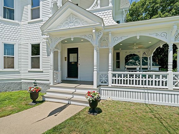 Built in 1900, the Albert and Hannah Brigham House is a magnificent, move-in ready Queen Anne Victorian overlooking the Whitman Town Park. The exterior charms with its lovingly restored, original siding (2021) and porch adornments. Upon entering, guests are greeted by a grand staircase, nearly 10-foot ceilings, and the formal dining room's original fireplace, built-in china cabinet, and parquet floors. The rooms are flooded with light from oversized windows (replaced in 2016). The updated kitchen includes custom cabinetry, a walk-in pantry, and stainless-steel appliances. Upstairs awaits four bedrooms, a full bathroom, and a balcony that overlooks the park. The fully-insulated walk-up attic features ample room to serve as storage or conversion to additional living space with its own 50A sub panel (2024). Roof 2010. Oversized second story A/C heat pump 2019. 200A electric panel, wiring, and generator hookup 2024. Gas boiler 2024. Gas fireplace 2019. Town Sewer/water/gas.