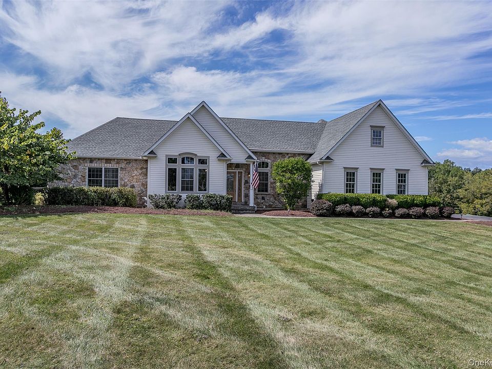 Welcome home to easy one level living in luxury! The wide entry welcomes you with inlaid hardwoods, 12 foot ceilings, and sweeping views. Massive family room with convenient gas fireplace has a wall of windows overlooking the koi pond, fenced yard and views for miles of the mountains. Primary bedroom offers tray ceiling, sitting area with large windows, walk in closet, 5 piece primary bathroom, and access to the back patio and yard. Three additional bright bedrooms, 2 with walk in closets and guest bath complete the home. Huge unfinished walk out basement provides endless storage or more living square footage. Many amenities, including koi pond, generator, pocket door, retractable rear awning, whole home speaker system, central vacuum, and more!
