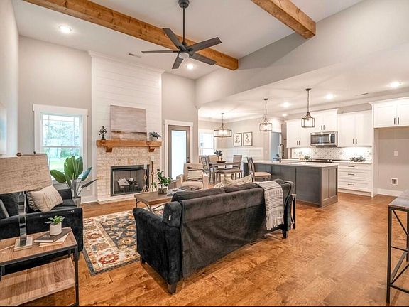 Craftsman-style exterior accents welcome you into a thoughtfully designed home filled with natural light, crown molding, custom trim, and beautiful true engineered hardwood flooring throughout the main living areas. The living room makes an immediate statement with exposed beams and a custom stone fireplace, flowing seamlessly into the open-concept kitchen and dining area.