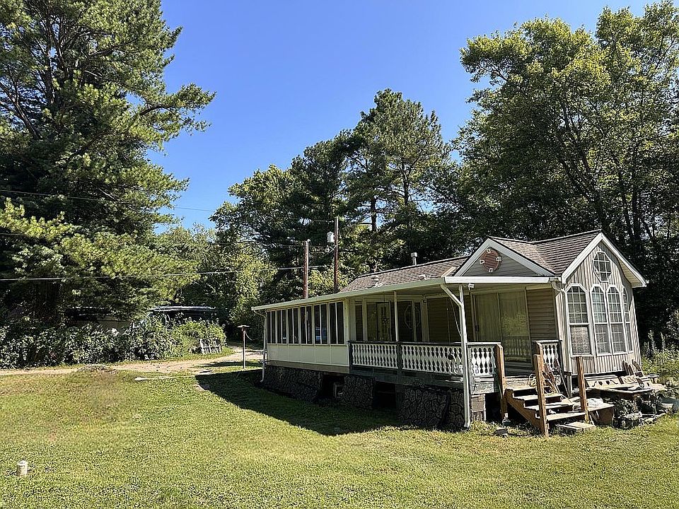 Has 10’ covered porch the entire 35’ length of the house on one side. 20’ of that is an enclosed 4-seasons room with screens and windows. The remaining 15’ of the covered porch is open.