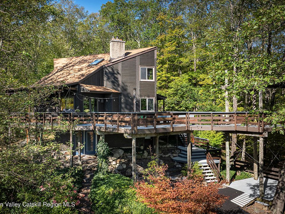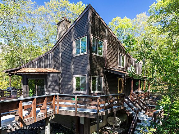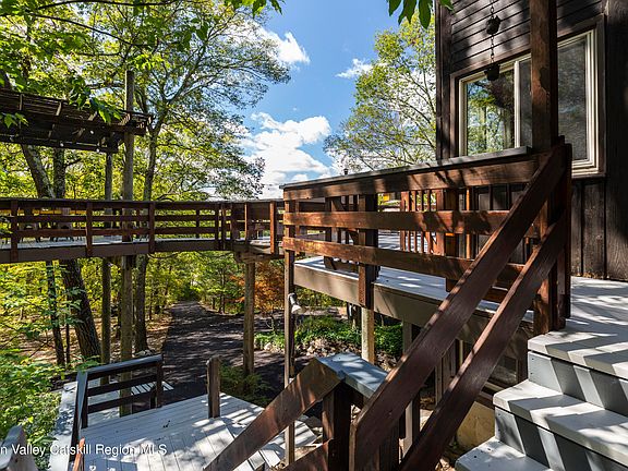Perched at the highest point on one of the most sought-after roads in New Paltz, 94 Sparkling Ridge is a one-of-a-kind property offering breathtaking views of the Shawangunk Ridge. From your deck, you can literally see people tackling some of the best rock climbing on the East Coast on the face of the 'Gunks. Nestled on 5.6 wooded acres adjoining the 8,000-acre Mohonk Preserve yet just minutes from town, this treetop sanctuary provides an unparalleled retreat within easy reach of restaurants, shopping, etc. The expansive elevated decking features multiple areas for relaxation and dining, fully immersing you in nature. Inside this distinctive three-level home, filled with quirks and character, there are 4 bedrooms plus an office, hardwood floors, high ceilings, walls of windows, skylights, and 2 fireplaces. The recently renovated lower level has walk-out access, a full bath, and a separate entrance, offering versatile living options. Located in the township of Gardiner, just 5 miles from Wildflower Farms Auberge and less than 90 minutes to the GWB and NYC, this property is conveniently within 30 minutes of Kingston, Kerhonkson, Accord, Stone Ridge, and the MetroNorth stop in Poughkeepsie, this is the Hudson Valley getaway you've been dreaming of!
