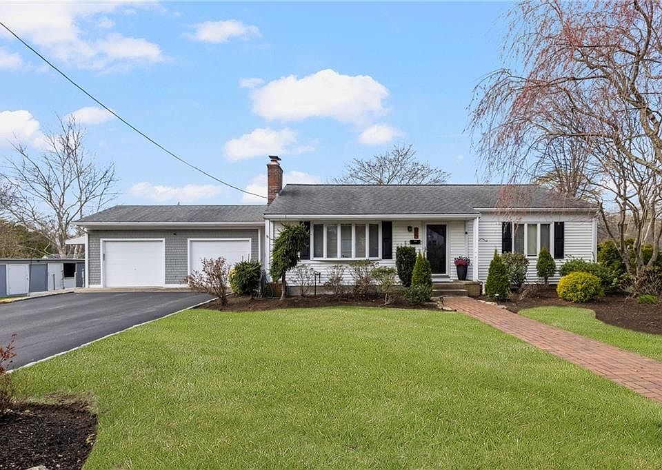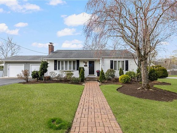 Enjoy the convenience of being just minutes from East Greenwich’s Hill & Harbour district, where shops, restaurants, marinas, and coastal charm meet. This expanded ranch offers a comfortable layout with thoughtful updates throughout. A neatly maintained privacy hedge frames the property, complemented by a spacious deck and outbuilding. Inside, the living room features a wood-burning fireplace and freshly painted interiors and hardwood flooring. Picture-frame molding adds character in the hallway and dining area, which opens to an eat-in kitchen with a breakfast counter with seating on both sides. To the right of the home are three bedrooms and a full bath. A large family room off the back of the home offers a second fireplace and sliders to the deck for easy indoor-outdoor living. A secondary bath with shower and a large pantry closet add convenience and organized storage space. Additional highlights include a one-car garage and a lower level ready to be finished or customized by the next owner.