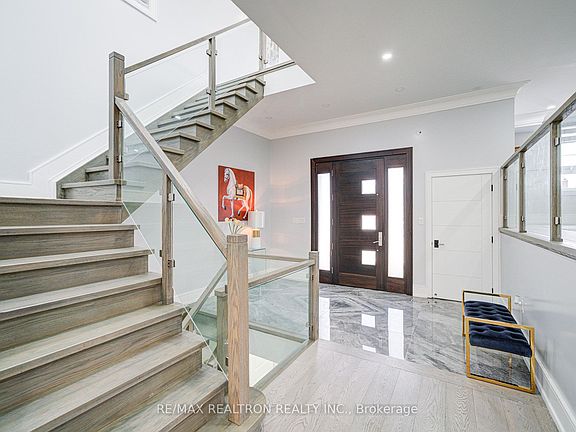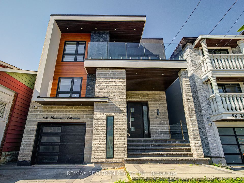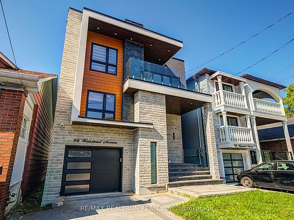Welcome to 94 Wanstead Avenue in Scarborough, a stunning 4-year-old custom-built luxury home offering over 3,265 sq. ft. of above-grade living space plus a 1,418 sq. ft. finished walkout basement apartment, featuring 5 spacious bedrooms and 6 bathrooms where every bedroom comes with its own bathroom. The main floor includes a versatile bedroom/office with a 3-piece bath, a formal living room, a warm and inviting family room, and an open-concept chefs kitchen equipped with a Sub-Zero built-in refrigerator, built-in oven and microwave, stainless steel gas range and rangehood, dishwasher, large island with breakfast bar, custom cabinetry, and modern light fixtures, making it ideal for both entertaining and everyday living. Thoughtful details such as wainscoting, coffered ceilings, an elegant staircase with iron pickets, abundant pot lights, skylights, and oversized windows throughout ensure natural light fills the home at all times, highlighting its refined finishes. The luxurious primary suite offers a fully organized walk-in closet and a spa-inspired 6-piece ensuite with a freestanding soaker tub, large glass-enclosed shower, and dual vanities, while the second floor provides access to a walk-out balcony perfect for morning coffee or evening relaxation. The professionally finished walkout basement apartment, with its own kitchen, living space, bedrooms, and private walkout entrance, is ideal for extended family, in-laws, or rental income. Additional features include hardwood flooring throughout, high ceilings, upper-level laundry with cabinetry and sink, energy-efficient windows, a beautifully landscaped exterior, a single-car garage, and a large deck overlooking the backyard. Perfectly situated in a family-friendly neighborhood close to schools, parks, shopping, Victoria PK Subway Stn, TTC transit, and major highways, this home delivers the ultimate combination of comfort, convenience, and modern elegance. 9ft custom-made elegant door