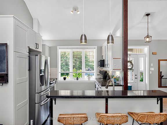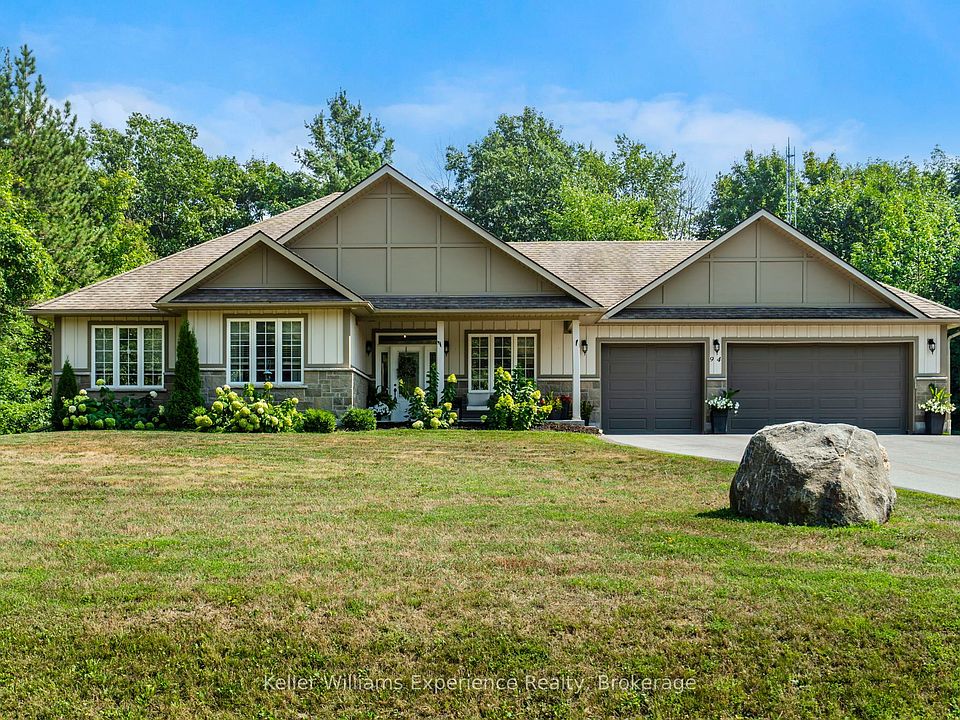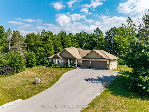 From the moment you arrive, the curb appeal is undeniable. This beautifully maintained bungalow offers a landscaped yard, stone accents, a welcoming front porch, and a spacious three-car garage. Built with full ICF construction, this home is exceptionally energy efficient and designed for lasting comfort. Situated on over an acre, the property boasts an expansive backyard oasis with multi-level decking, a hot tub, and a play area - plenty of space for outdoor living and family fun. Inside, a bright foyer opens to an airy, open-concept layout with vaulted ceilings, large windows, and a fresh neutral palette. The modern kitchen features stainless steel appliances and ample storage, while the dining area is perfect for gatherings. The primary suite includes a walk-in closet and 5-piece ensuite with a soaker tub, tiled shower, and double vanity. Two additional bedrooms and a full bath complete the main level. The fully finished basement offers a large rec room with projector setup and barn doors, a play area, dedicated home gym, two more bedrooms, and a full bath. Surrounded by mature trees for privacy, this move-in ready home is located in a quiet, family-friendly neighbourhood close to schools, amenities, and recreation.