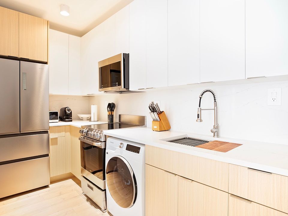 Modern vanityMatte black fixturesModern mid-century furnishingsIn-unit washerClean layoutStainless steel appliancesProvided bedding