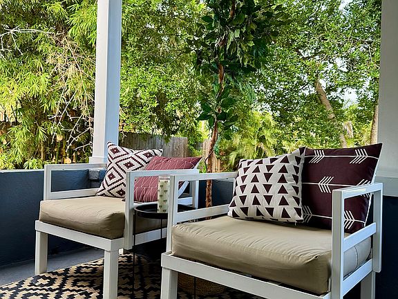 Unit Two is a spacious, one bedroom furnished private unit, and one of four (separate) apartments all beautifully redone, on a large, private, farmhouse style property in St Petersburg's historic Kenwood neighborhood. The whole property sits on a gated and fenced half acre lot. All units were renovated in 2021 with new kitchens, bathrooms, appliances, floors, new plumbing, electric, Central Air and an in-unit Washer/Dryer. Unit (2) is a lovely, bright and sunny ground floor apartment, overlooking the front yard, has a large, semi-private, fully shaded deep front porch plus an additional large, sun filled shared patio. All units share off street parking.