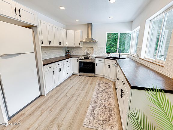 Come and see this beautiful, 5 acre, mountain retreat, less than 30 minutes from Schweitzer Mountain Ski Resort! This house features 3 bedrooms and 3 bathrooms, mud room, large vaulted ceilings in the Livingroom, and a beautifully remodeled kitchen! A new 4 zone ductless minisplit system has been installed, with A/C and heating capabilities down to -27, even the coldest winter nights will be warm, and if the power goes out you still have a brand new wood stove, on a custom hearth! The kitchen has incredible custom tilework, butcherblock countertops, and soft close drawers and cupboards. The laundry room/ mudroom features a frontload washer/ dryer, full bathroom, and easy access to the rear of the home. Up the stairs with the custom metal curving stair rail is a master bedroom suite with his and hers walk-in closets, a custom bathroom, and another spacious bedroom and bathroom. The 5 acres feature many mature trees and plenty of room for all your outdoor activities!