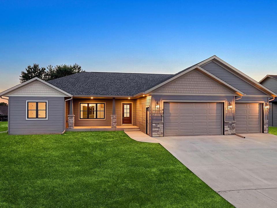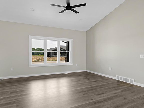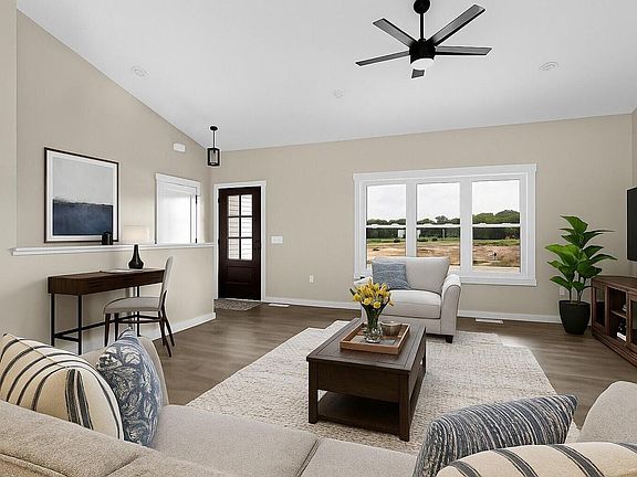Stylish, Spacious, and Designed for the Way You Live! Modern split-bedroom ranch with vaulted ceilings and an open-concept layout filled with natural light. Enjoy sunrises in the living room and sunsets from the covered patio off the dining area. The kitchen features a large island, quartz countertops, tile backsplash, and pantry. Drop zone from the 3-car garage includes a mudroom and separate laundry room with cabinets and sink. Private primary suite offers a walk-in closet, dual vanity, and walk-in tile shower. Semi-private backyard and room to expand in the lower level. SPECIAL FINANCING AVAILABLE.