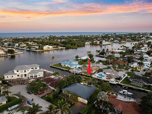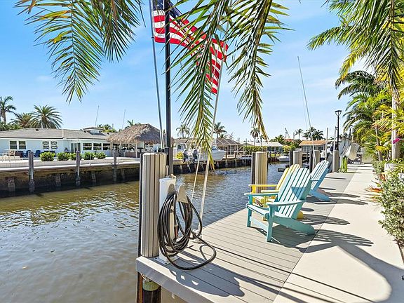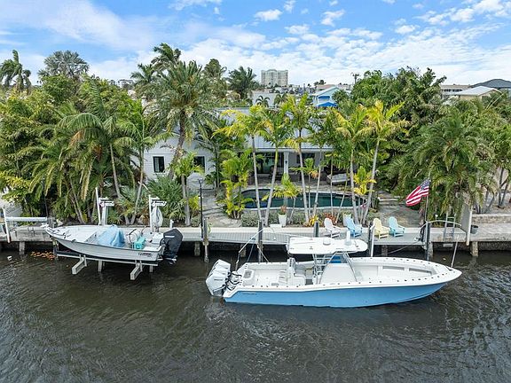 This exceptional waterfront residence has been completely rebuilt from the ground up, with only one original garage wall retained to meet city remodel regulations. Elevated to enhance views and offer added storm protection, the home, back patio, and dock sit on a raised lot that maximizes both lifestyle and longevity. Boating enthusiasts will appreciate the 90 feet of prime waterfrontage, complete with a private dock, 20,000-pound boat lift, wet slip for vessels up to 50 feet, water and electric hookups, and a built-in filet station. With direct ocean access and no fixed bridges, the inlet is just two miles away--making this a rare opportunity to own a true boater's paradise.The home is available fully turnkey, complete with fine furnishings and all the daily essentials. It is truly living with 11-ft bedroom ceilings and a cathedral-ceiling great room.