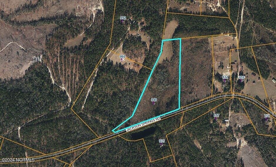 Price reduced by $76,000+! 12.32 acres zoned residential agricultural with no restrictions in popular Jackson Springs with great Moore County schools! This land was timbered several years ago and requires cleanup. There is a wet area on the far side that has trees surrounding it — this may be a natural spring, which is great for watering livestock, or perhaps a small pond. There is a flat grassy area near the top of the parcel that would be an ideal home site. The buyer must install a driveway and get a well and septic permit. The broker/owner will consider financing the sale. An ideal site for a farm. The home site is ideally located for panoramic views of the entire parcel and future pastures. Note there is an easement on the far-left side of the road front for the neighbor's driveway. There are some wetlands on the parcel but the public wetlands maps may show more wetlands than exist. A wetlands survey will be needed to find the exact number of acres with wetlands. The seller is firm on the price and will NOT prepare the site for permits.