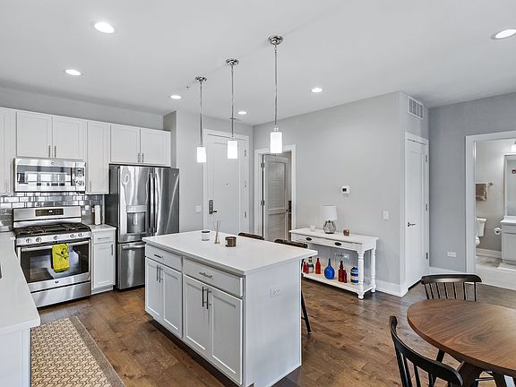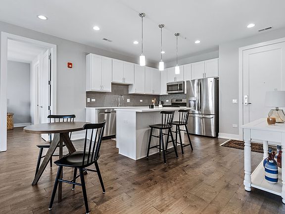 Two bedroom/two bathroom condo in the heart of downtown Downers Grove! The bright kitchen features a large island with storage, white shaker cabinets, quartz countertops, and stainless steel appliances. An open-concept living and dining room blend seamlessly and are great for entertaining with convenient access to the balcony. The primary suite features access to the balcony, a large walk-in closet, double sinks, a bath, and a shower. A full-sized laundry room provides additional space for storage. One indoor, heated parking space #55 included. Upgrades include engineered hardwood flooring in both bedrooms, custom blinds on all windows, front load LG Steam washer & LG sensor dryer. Stunning lobby with beautifully furnished lounge, club room with kitchen/ bar, and a fitness room. The outdoor common area includes social seating, fire pits, and a gas grill.