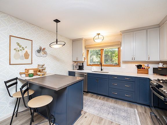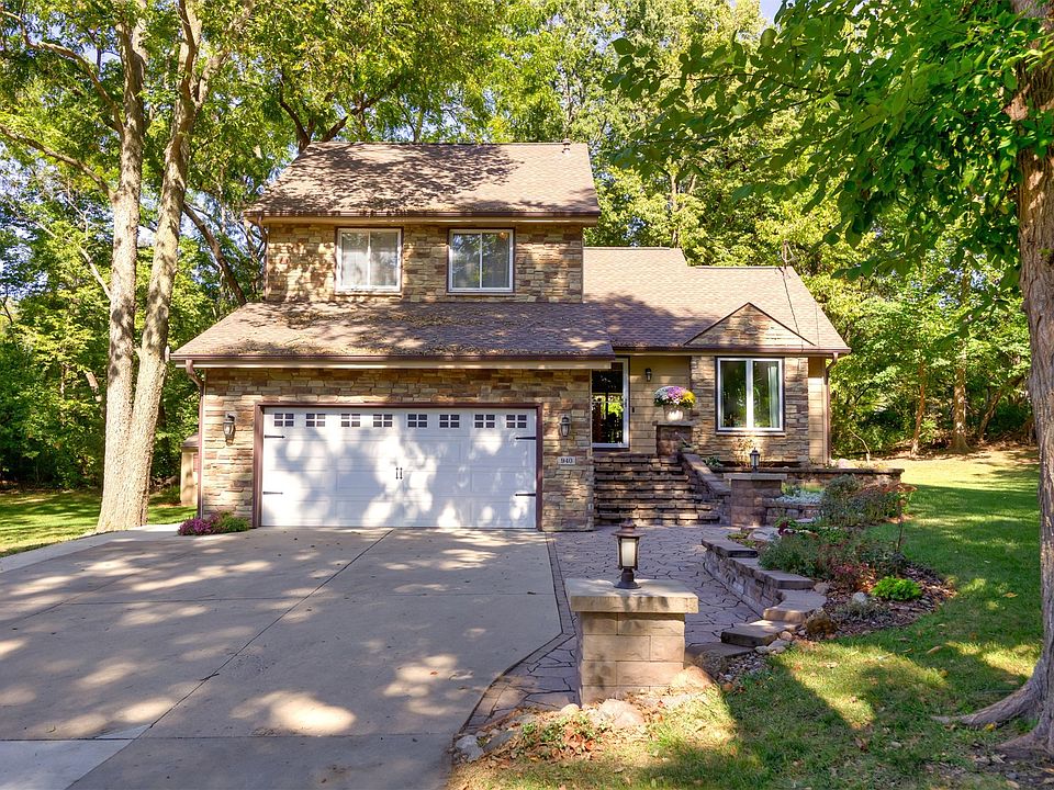 Beautifully updated 2-Story on over half acre lot with tons of mature trees! As you approach the home you are sure to appreciate the newly done stone front walkway! Off the front entry is a sun room - perfect for plants, office, or front sitting room! The kitchen has been stylishly updated with dark navy lower cabinets and light gray uppers and features quartz countertops, tile backsplash and stainless steel appliances - function meets beauty! Kitchen leads into dining area with sliding doors out to the perfect deck and fire pit area to enjoy the outdoors! Living room is spacious with large windows letting in tons of natural light and over looking green space! Living room has large brick fireplace and leads through to 1/2 bath and 1st floor laundry room. Upstairs features 2 bedrooms centrally located around linen closet and full hall bath with brand new shower. Primary bedroom is large with huge windows, walk-in closet, and updated bathroom with double vanity, heated tile floors, and full tile shower with glass doors! Heading down to the lower level you'll pass by 2 car attached garage access and landing area with drop zone. Lower level features 2nd living room, utility room with extra storage, storage closets, and a non-conforming bedroom with 3/4 attached bathroom. SO much to love in this home! Quick access to I-35 to get you anywhere in the metro! Come see today!
