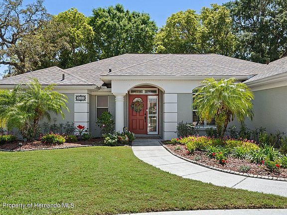 Glen Lakes is an exclusive G&C Club Community! Through the 24hr guarded entrance to the home that welcomes you with an appealing elevation, beautiful landscaping and the only circular drive on the street! Entry into the Alexander Custom Home you feel the tranquility and your eyes are immediately drawn to the outside pool area by the 12' set of glass disappearing doors that gives a sense that the outside and inside space are one! Upon entry to the right the formal dining area displays a piano and shows the versatility of this space due to the extra large kitchen breakfast area, breakfast bar and poolside dining THIS IS plenty formal in paradise! The home's main living area boasts cathedral ceilings, adding volume to the already open floorplan, plantation shutters, wood-look porcelain tile plank flooring and plant shelving are just some of the added features of the home. The kitchen has granite counters w/pickle washed-oak cabinets and SS appliances less than 5yrs old that includes a double oven. A SS sink with a gooseneck water fixture makes cleaning and filling large pots easy! The kitchen bar overlooks the breakfast area to the pool thru a wall of windows and beyond the pool is a privacy hedge. The main ensuite is to the left of the front entry and offers a walk-in closet and disappearing sliding doors with a view of the lanai and pool as you drift off to sleep! The bath has wood cabinets, granite counters and double sinks with a vanity. The tiled step-in shower has a tiled bench and a glass block window allowing natural but obscured lighting in. The frameless heavy duty shower door means no more tracks to clean!!! On the opposite side of the home are two additional ample sized bedrooms and a bath. Each bedroom has a ceiling fan/light fixture with nice windows making them light and bright! Both guest bedrooms offer large, double closets for storage. The guest bath opens to the pool deck for swimmer's convenience and also has granite countertops with wood cabinets and a tub/shower combo. From the Kitchen is nice sized laundry room with a utility sink, cabinets and a window, another door leads into the garage which has a side door for easy access to the outside. The pool is kept sparkling with a new Bluetooth robotic vacuum and new pool pump added in 2023! There is an outside Jenn-Air grill with lower cabinets. The entire lanai and pool deck are paved, and the lanai ceiling is vinyl for ease of maintenance! The lanai has 3 ceiling fans with lights to keep you cool on those summer evenings! Glen Lakes monthly HOA fees include basic cable, high-speed internet, 24-hour live security, streetlights, and common ground maintenance. OPTIONAL Memberships are available for Golf or a Social Membership, both types offer full dining, a nineteenth hole bar and grill, a gym overlooking Aqua Range Lake, large pool with heated spa, tennis, pickle ball courts and social clubs...AGAIN only if you choose to join! To be so close to the coast but not in a mandatory evacuation area or flood zone is big! Water sports abound with the Gulf of Mexico and Weeki Wachee River close by. Shopping, eateries, medical facilities are less than 6 miles away and 4 hospitals within 30min. About 9 miles you can catch the ramp on to the Suncoast Parkway and head south to Tampa Bay Area and all it offers in less than 45min. Orlando to the east, Clearwater/St. Pete Beaches to the south are less than a 1.5hr drive!
