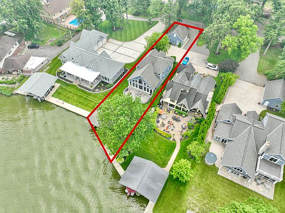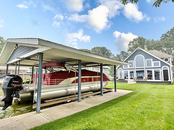 Immaculate 4 bed/2bath waterfront home on Shawnee Island's prestigious Lakeshore Dr! Outside features panoramic open water views, full-length patio with Trex bench seating, double covered boat dock & 57' of waterfront. Inside has an expansive living room with 24' cathedral ceiling, wood beams, wet bar, & incredible wall of waterside windows. This 3106 sq ft home boasts gorgeous woodwork throughout, including a built-in bookcase that adds an elegant touch. Oversized first-floor master bedroom features a 6'x8' walk-in closet. The 2nd first-floor bedroom is a true gem with its arched windows & cozy window seat. Upstairs features two huge bedrooms, full bath, laundry chute & open loft to living room. The 28'x26' detached garage with 18' door is great for storing cars, golf cart & lake toys.