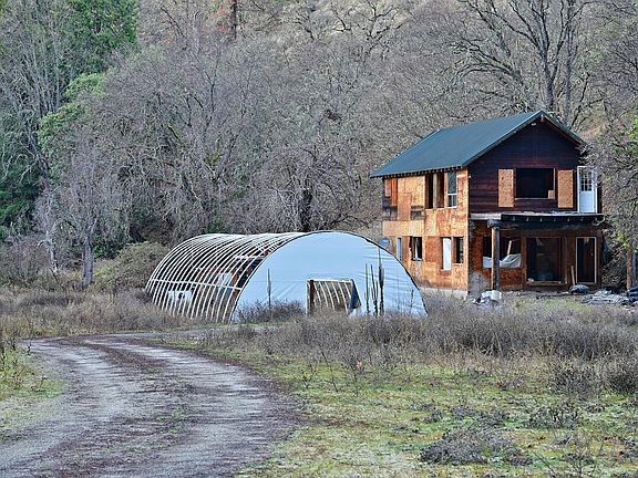 Beautiful and accessible Little Applegate River frontage! With irrigation rights and flat farmland bathed in sunlight, this parcel is a haven for agricultural enthusiasts, offering high-quality soil ideal for farming endeavors. Manufactured home is not livable but holds the home site and overlooks the terraced garden space. The unfinished structure is permitted as a workshop and offers approximately 1,800sf of space. Extra large barn, several greenhouses, and 2 full RV hookups round out the infrastructure. The property backs to BLM offering a multitude of recreational opportunities and privacy. This wonderful mix of farmland, forest and river frontage doesn't come along every day! Property being sold as is - cash only.