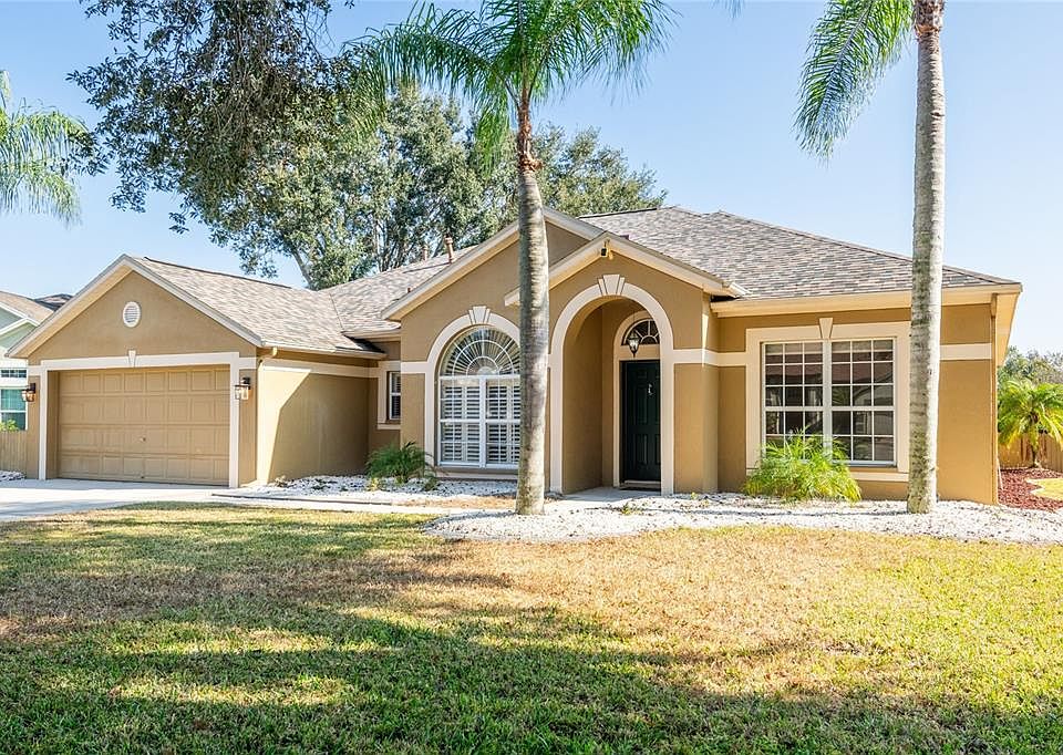 One or more photo(s) was virtually staged. Welcome to this meticulously maintained 4-bedroom 2 bath pool home in the highly sought after gated community of River Watch located on a tree-lined quiet cul-de-sac. The open foyer leads you directly to separate living and dining rooms enhanced by brand new luxury wood like vinyl flooring, crown molding and elegant plantation shutters which are the window treatments throughout this lovely home. Chef-inspired Island kitchen is equipped with stunning granite counter tops with beautifully accented backsplash, custom 46-inch wood cabinetry with crown molding and glassed fronts, complete stainless appliance package including vent through 2023 microwave and 2025 Bosch dishwasher, deep double sinks and café style breakfast nook. Expansive tiled family room offers double sliders that connect seamlessly to the screened lanai with a spectacular view of the serene conservation area and pond. Split layout boasts a private owner suite featuring linen closet, dual granite vanities, crown molding, soaking garden tub, glassed shower, generous walk-in closet and a single French door entrance to the pool area. The WOW feature of this exceptional home is the outdoor living space including sparkling pool, freestanding 4-person 2024 Sauna and the breath-taking waterfront/conservation view. Additional upgrades include 30-year Owens Corning NEW ROOF 2025,13Kw whole home generator 2025, freshly painted interior and pool heat pump 2021.Conveniently located to excellent schools, shopping, restaurants, MacDill AFB and primary roads. ALL THIS AND NO CDD!