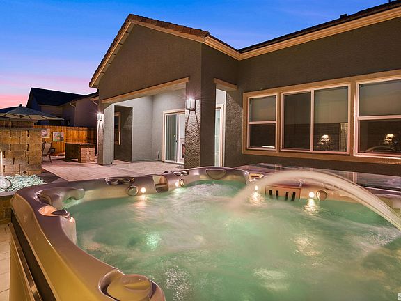 Step into a home that truly feels like home without compromising on elegance or high-end design. Tasteful engineered wood floors flow throughout the main living spaces, while soft Celeste-toned walls create a soothing backdrop for everyday living. This beautifully designed, meticulously maintained, single-level home features 3 spacious bedrooms with ensuite bathrooms, each a unique theme. The expansive great room welcomes you with its open layout and stunning views of the backyard oasis., Gather around the TV as the gas fireplace glows warmly beneath, creating the perfect ambiance for relaxing or entertaining. In the kitchen, you’ll find sleek granite countertops, an extended island for entertaining with seating, premium stainless-steel appliances, with custom cabinets with ample cabinet storage, soft close doors, roll-out glides, adjustable custom shelf pins and custom hardware—a true chef’s dream. The master suite is both stunning and spacious, a serene spa island theme retreat at the end of a long day. The primary bathroom boasts dual, separate vanities, dual shower heads, upgraded extended tile work, a large soaking tub, safety bars, and a beautifully designed shower. The walk-in closet is so generous, it could almost be considered a room of its own. Step outside into a backyard built for entertaining—a wraparound patio paradise featuring a cozy fireplace, two tranquil waterfalls, a relaxing saltwater sauna, and custom-built furnishings thoughtfully placed for maximum enjoyment. The spa area is designed with both comfort and sophistication in mind. This beautifully upgraded home also features an epoxy garage floor, modern window coverings, smart lighting with wall-switch-controlled outlets, three stylish ceiling fans with a patio fan option, front security cameras, internet boosters, four exterior spigots, extra side outlets, upgraded bathroom and laundry fans, a remote-controlled fireplace, accent lighting in the hallway and master bath, premium carpet with the best pad available, built-in office and laundry cabinetry, and a spotless, deep-cleaned interior. This home offers every amenity a family could dream of. Just a five-minute drive brings you to Cyan Park, where you'll find a dog park, multiple playgrounds, tennis courts, and basketball courts. Residents of Bella Vista also enjoy exclusive access to the community clubhouse, which includes a state-of-the-art fitness center, a near Olympic-sized pool, and a spacious indoor and outdoor gathering area perfect for hosting parties or events. See the Virtual Tour link for additional photos