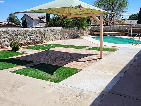 Welcome to this 1 owner home that has been cherished and maintained. The large kitchen with buffet counter and glass door cabinets are as inviting as they are functional. The chandelier, refrigerator, dishwasher, and stove are included with this house. There is also a disposal. This spacious home offers an attic for extra storage. The backyard is great for entertaining or simply relaxing with a canopy and swimming pool. The shed will give room for extra storage. The backyard and dog run have synthetic grass for low maintenance There is a dark room with a sink off the garage. The enclosed back porch offers a Franklin Stove. This house is being sold as-is at a very attractive price. The location offers easy access to US-54, Loop 375, Fort Bliss, parks, schools, shopping, the new and upcoming Sunset Amphitheater, even the bus stop. This is a terrific investment property or ready to move-in.